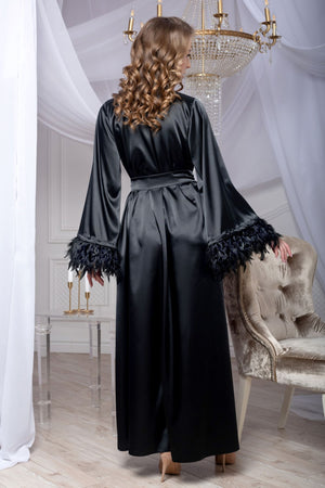 Black Satin Feather-Trim Kimono Robe – Elegant Boudoir Style