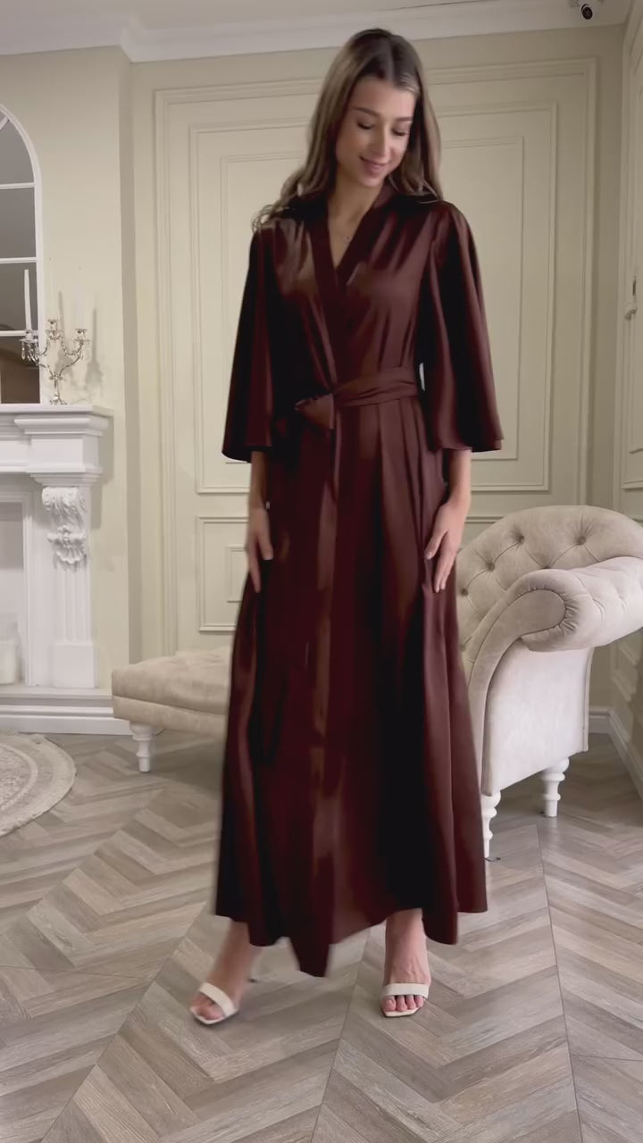 Maxi Robe Dressing Gown 3/4 sleeve Brown satin