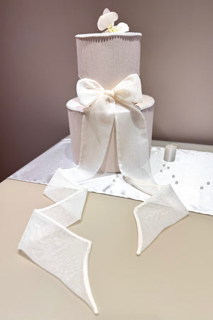 Enhance your special day with our chiffon ribbons and wedding cake topper bows, crafted from soft, flowing chiffon for a light and elegant effect. These adaptable decorations add a romantic and sophisticated touch to your event, ideal for adorning wedding and celebration cakes, wrapping bouquets or floral arrangements, embellishing chairs, invitations, and favors, as well as creating refined table settings.
