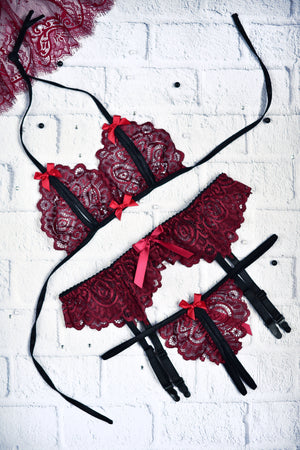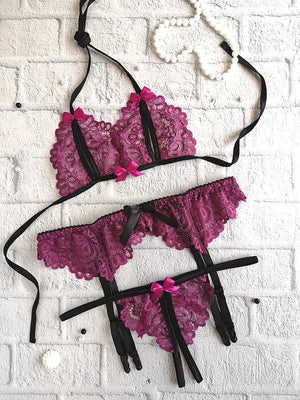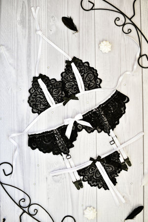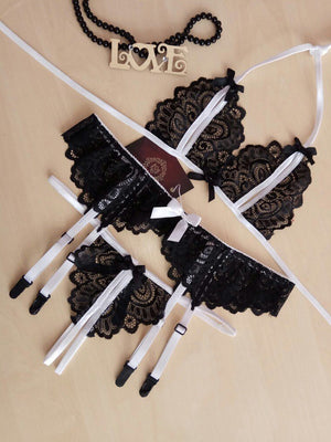 Lace Lingerie Set: Bra, Garter Belt and Crotchless Thong