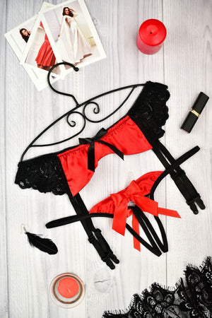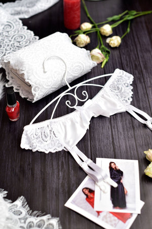 This garter belt and thong panty set is made from lace and satin, giving you a feeling of sensuality and confidence. The panties have an open crotch, and the set includes a suspender belt for added elegance. Perfect for your wedding night or honeymoon, this lingerie set will set the mood.