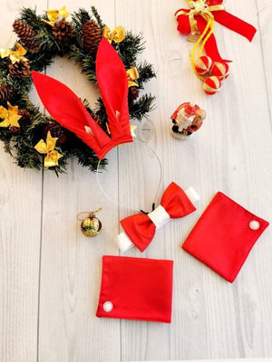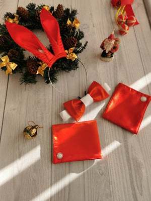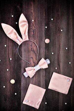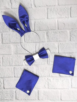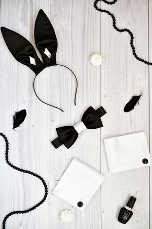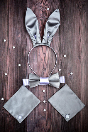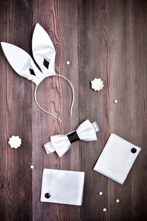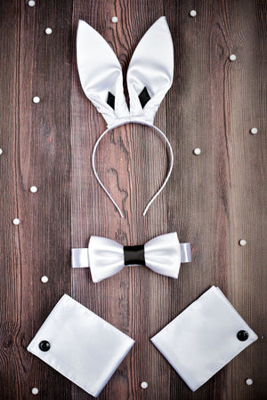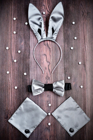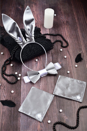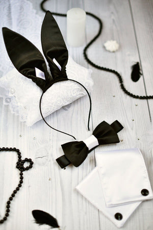 This role play set consists of 4 items: bunny ears, 2 cuffs, elegant bowtie.