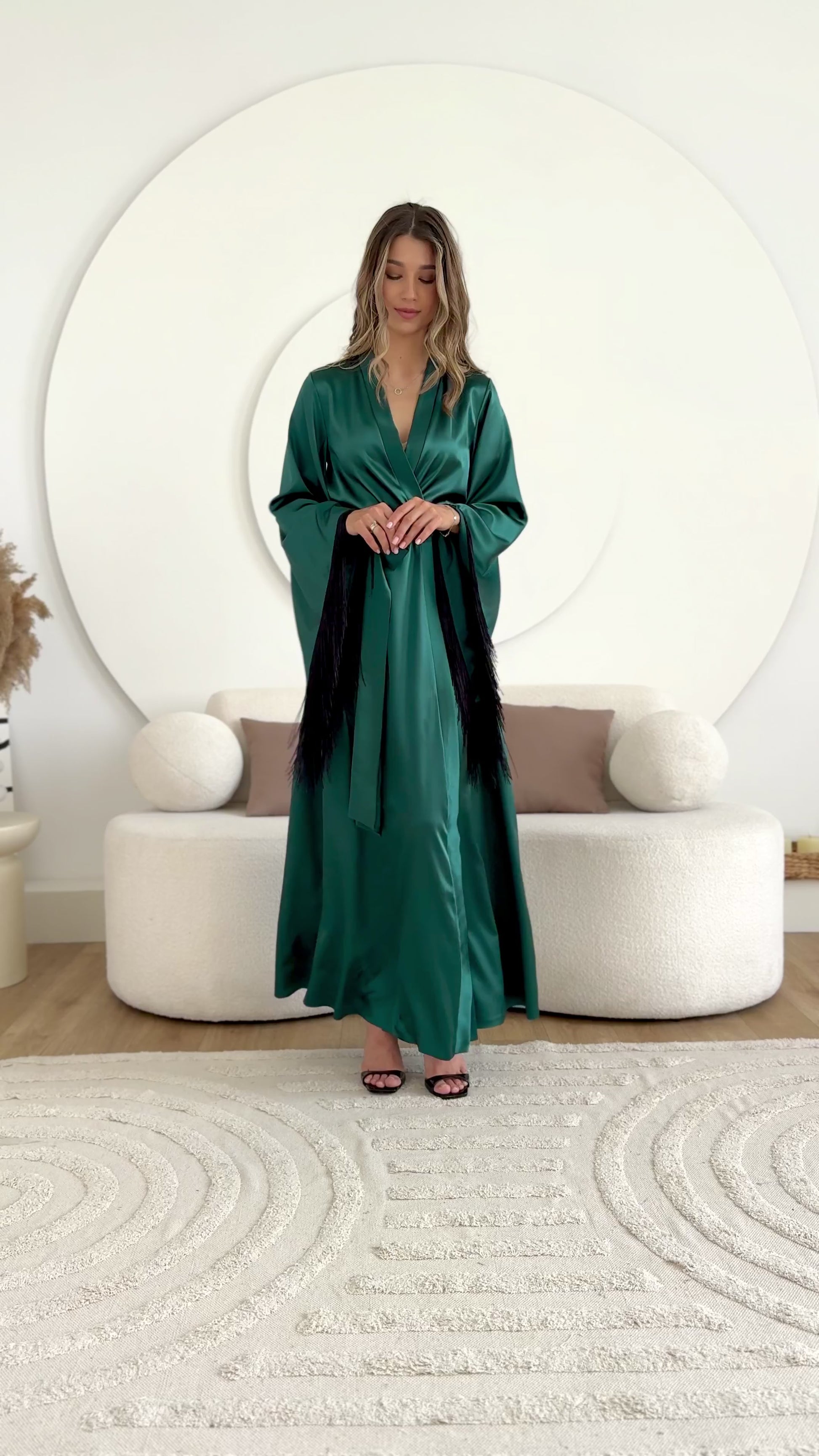 Wrap yourself in elegance and allure with our kimono robe — a statement piece designed to make you feel as luxurious as you look. Crafted from silky-smooth satin, this full-length robe drapes beautifully over the body, while the wide sleeves add a dramatic touch of glamour. The standout feature? Bold black fringe detailing that dances with your every move, bringing playful sophistication to your lounge or boudoir style.