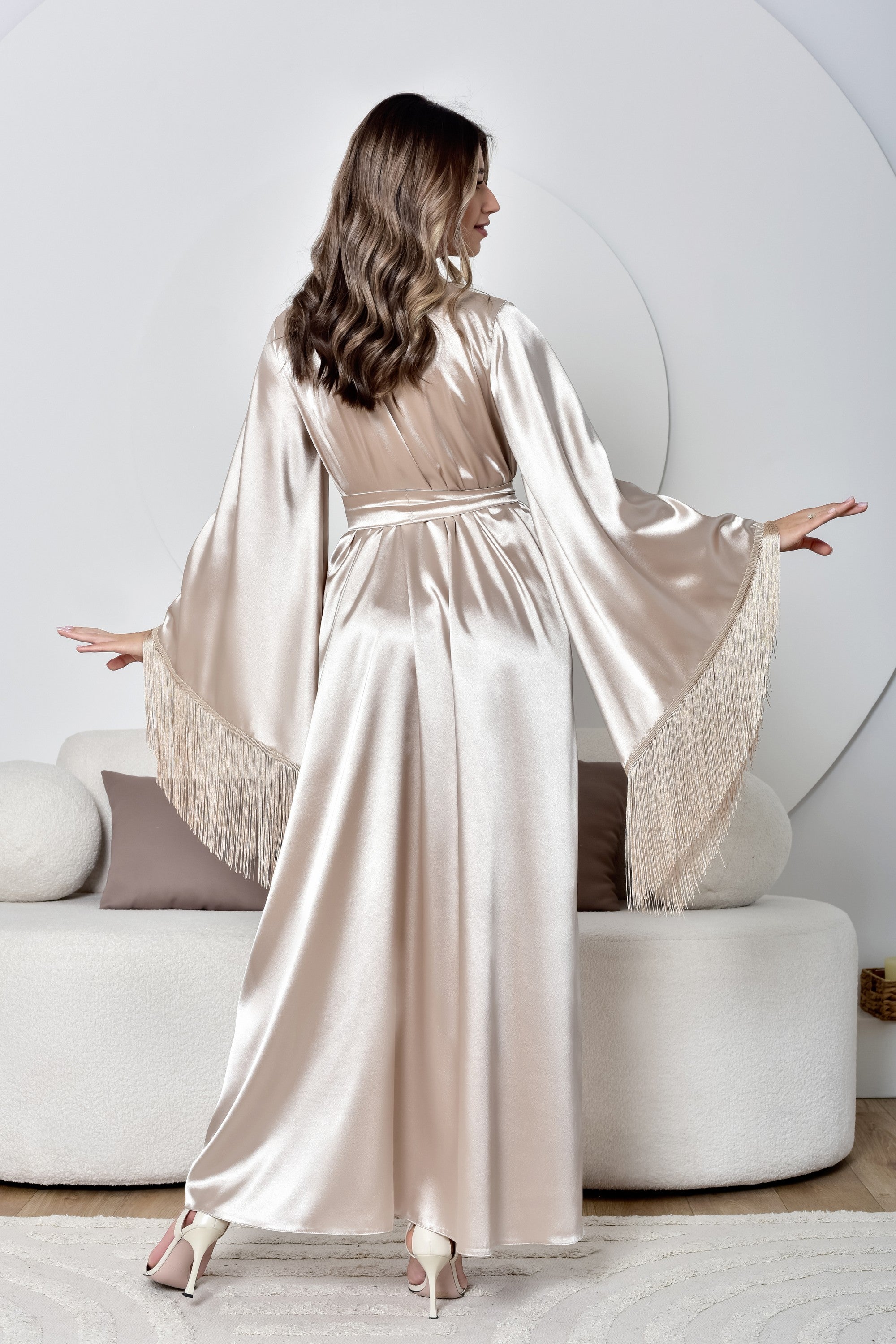 Long Beige Satin Kimono Robe with Fringe Sleeves – Bridal & Bridesmaid Robe