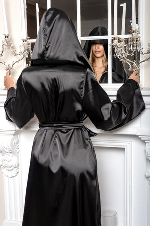 Discover the epitome of opulence with this expertly designed, enigmatic black dressing gown. Its timeless design exudes luxury and grandeur, and the enchanting hood adds a playful element. Versatile and must-have, this robe will quickly become a staple in your wardrobe.