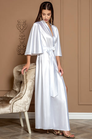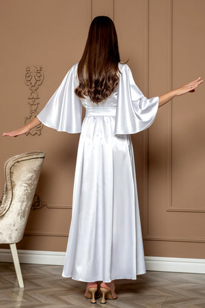 Wrap yourself in pure elegance on your wedding morning with our white kimono robe. Crafted from luxurious satin, this robe drapes gracefully and feels as soft as a whisper against your skin. The wide kimono sleeves and flowing silhouette create an angelic, romantic look — perfect for unforgettable bridal photos and the most special moments of your day. This robe is not only for brides — it also makes a thoughtful bridesmaid gift or a timeless piece for romantic evenings.